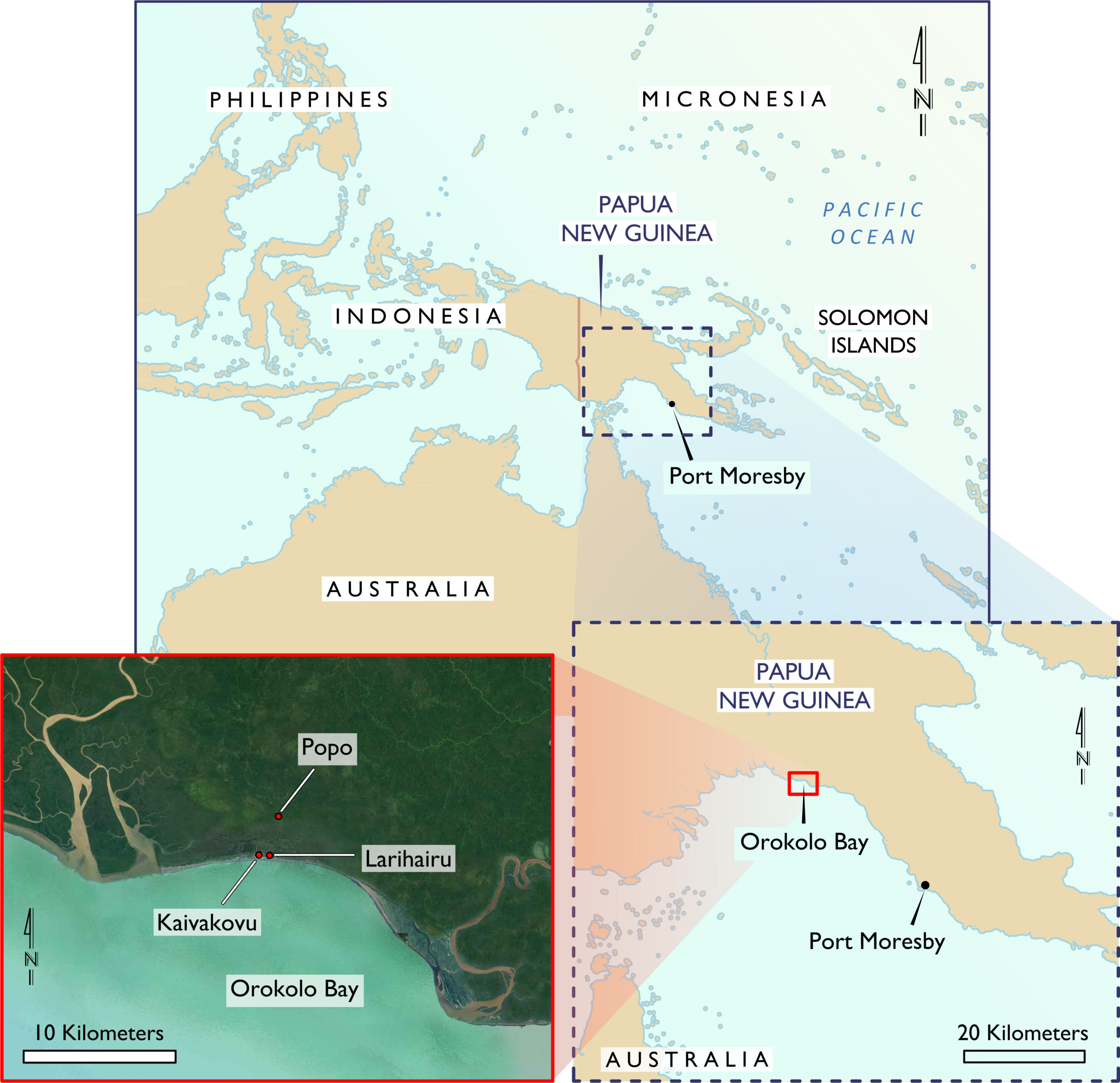 Popo is a legendary migration site for Orokolo Bay residents and for many other clan (bira’ipi) and village groups living in coastal locations up to 125 kilometers farther to the east. According to local Oral Traditions, the village was inhabited by ancestors between 16 and seven generations ago, or roughly 400–175 years ago. (Western dating techniques put it at 700 to 200 years ago.) Clan-based social structures, 15-meter-tall cathedral-like buildings called longhouses, and ceremonies were all developed there. Locals recount that the site was divided into estates or “suburbs,” which belonged to the different clans that today occupy the coastal villages. The place known as Maivipi is one of these estates. Popo is also a cosmological origin place; their stories tell how the entire world was made there.
