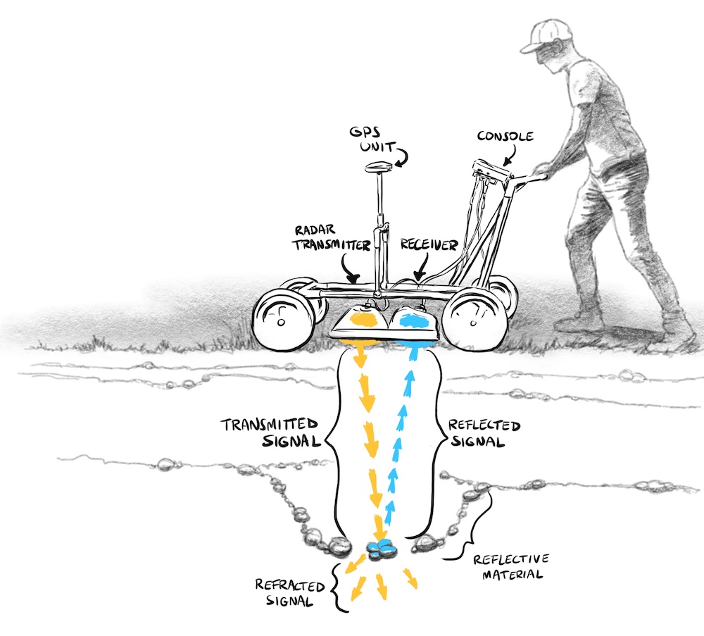 To help find these graves, archaeologists (both Indigenous and non-Indigenous) use ground-penetrating radar (GPR) technology. As a GPR device is moved across the landscape, it produces electromagnetic waves and records the signals’ return, allowing us to visualize what’s below the ground’s surface. GPR is useful for finding grave shafts, where ground has been disturbed, but seldom “sees” the contents of the burial itself.