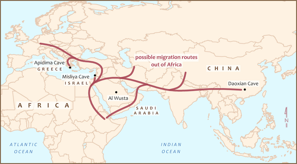 In 2018, researchers in India published on the discovery of a collection of advanced stone tools. They say this find indicates a hominin presence stretching back at least 170,000 years—millennia earlier than previous research suggested. And some evidence suggests early humans may have headed directly toward Asia by crossing from Africa over the Arabian Peninsula, altogether bypassing the Levant, where so much of the earliest evidence of humans outside Africa has come from.