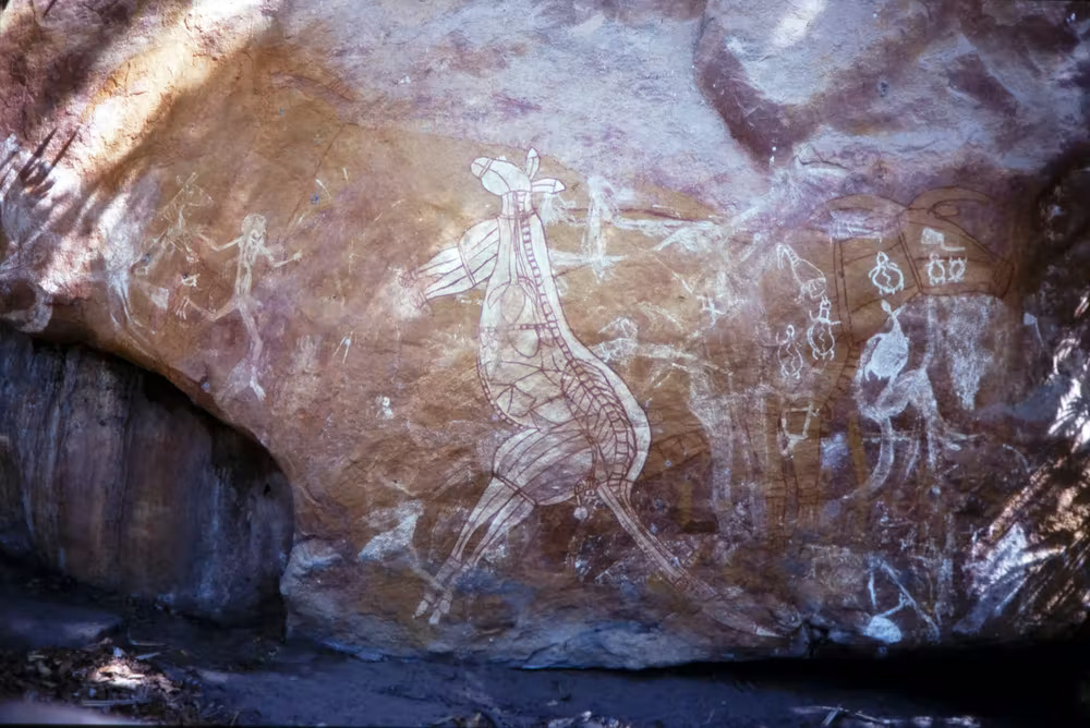 Some art is even invisible. Two Leg Rock in Kakadu National Park is shaped like a pair of human legs. At its pelvis, over the right hip, there is a painting of an important Ancestral Being in the form of a kangaroo. The painting is depicted in bright, stark white pigment—delek. But visitors to Two Leg Rock today will not see it.