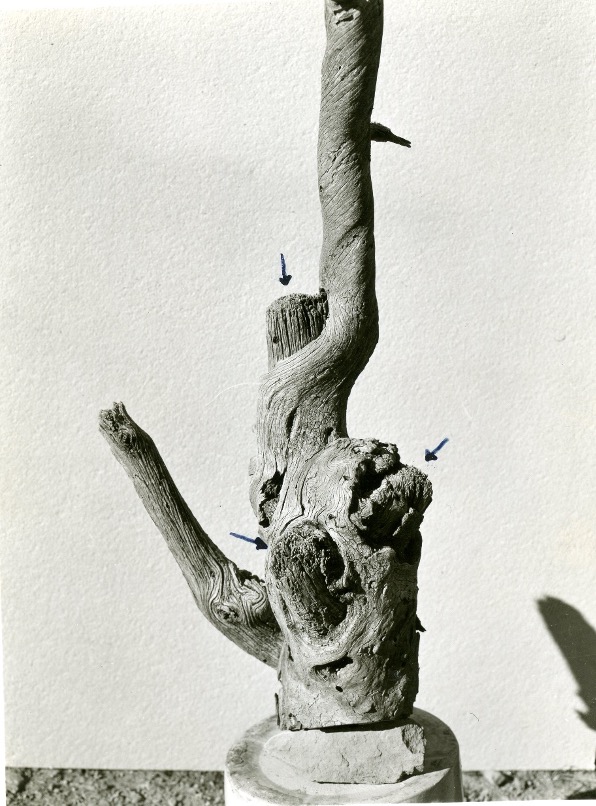 In 1965, archaeologists Robert Nichols and David Smith published a tree-ring date of A.D. 1289 for a small stump growing vertically out of Schulman Old Tree’s second stem section. They believed, based on that stump’s morphology, that it was cut with a hafted stone ax. If correct, it would have been the first time archaeologists published a date for a limb cut with an ancient stone ax anywhere in the U.S. Southwest.