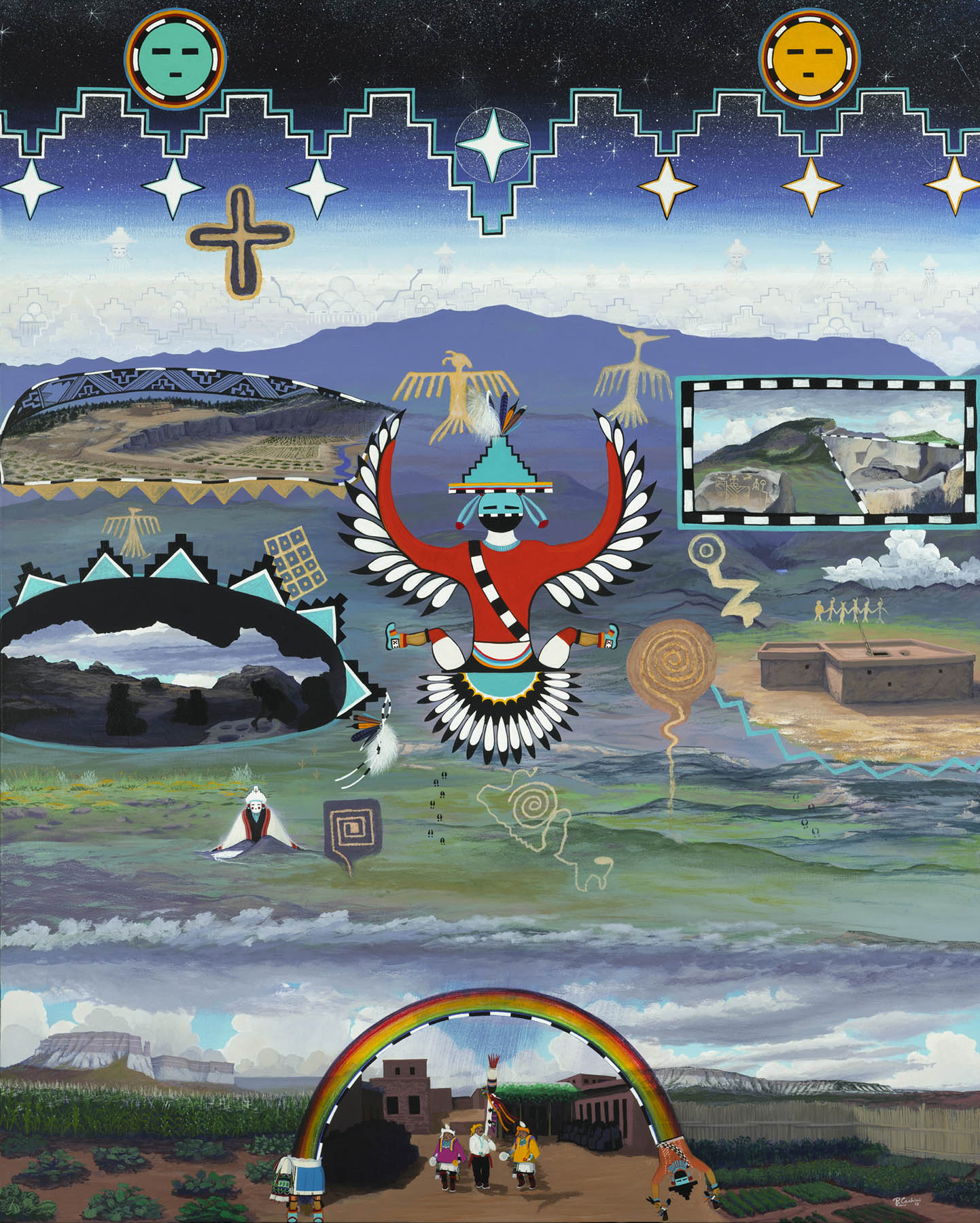 Ronnie’s painting has three horizontal parts. The bottom third offers a view from Zuni Pueblo looking south towards Reserve, with a harvest dance occurring beneath a rainbow.