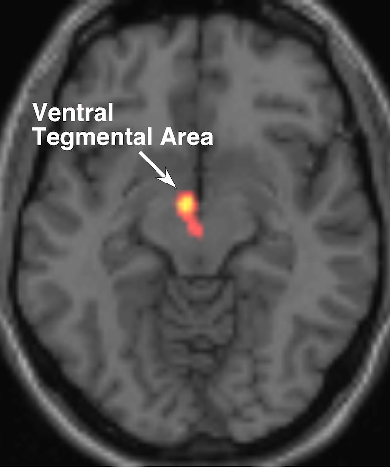 Romantic love comes with a lot of different emotions. But in the brain scanner, everyone who is madly in love has common activity way in the base of the brain: in the ventral tegmental area (VTA). This brain region pops up the dopamine—a chemical messenger in the brain that gives you energy, focus, motivation, and craving.