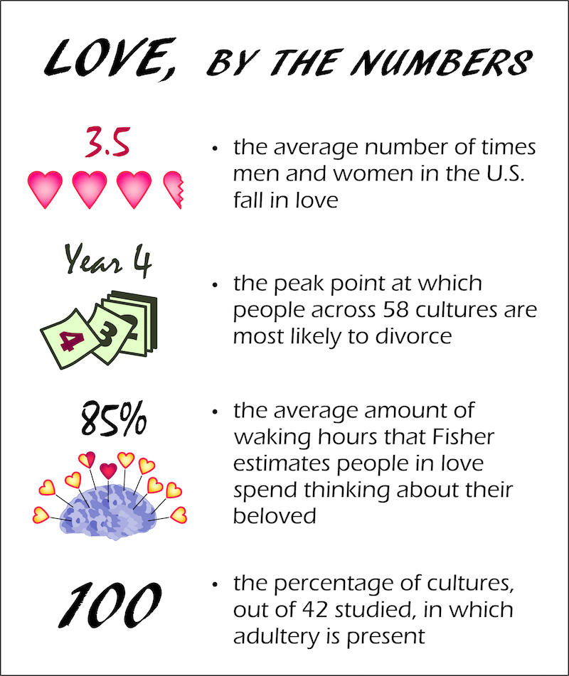 HF: I would never put a number on it, but it’s certainly more than one. I’ve got unpublished data on more than 50,000 people from the U.S. census, and the average number of times that American men and women fall in love is 3.5.