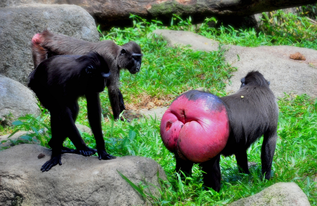 In most macaque species, there are one or two peak times of the year for mating. At those times, most females go through a variety of physiological changes. The skin around the females’ vaginas and anuses can become slightly swollen (massively so in some species) such that any male can notice. These females also undergo behavioral shifts, causing them to spend more than the usual amount of time following males and presenting their rear ends to those males in an invitation to have sex. If the males do not respond well, females will shake their heads in front of the male’s face, sometimes grabbing his facial fur for emphasis. If that fails, they might grab the male’s genitals as a last-ditch effort.