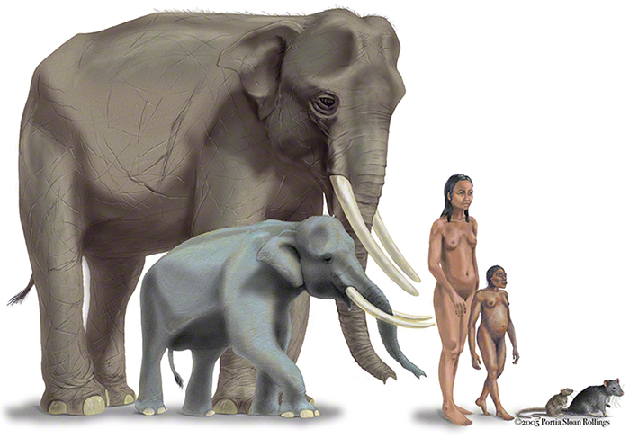 Hominins and Stegodon, typically large-bodied mammals, both became dwarfed on the island of Flores in Indonesia. Small mammals, like rats, got bigger.