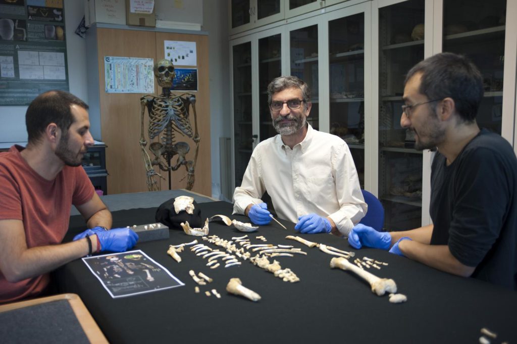 Left to right: Antonio García-Tabernero, Antonio Rosas, and Luis Ríos beside the skeleton of a Neanderthal child found in Spain.