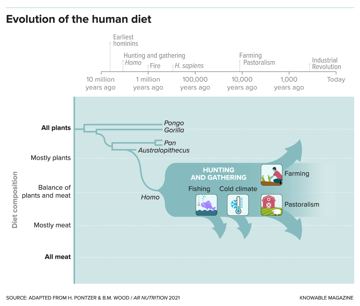 And you can look at the human body and see how we’ve adapted relative to our ape relatives—what’s changed in us in terms of how we digest food. You can look at things like gut anatomy and tooth shape. And if you look at that, again, the signal is kind of omnivorous. It isn’t particularly meat heavy.