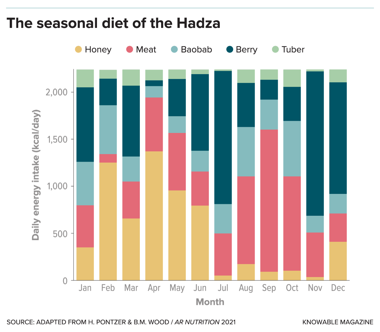 People have been working with the Hadza for decades now, so we have these long-term records, papers published from 30 or 40 years ago up through to today. We can understand from those data how variable diet can be: We’ve seen how the amount of meat changes with the seasons. It’s more skewed toward plants during wet seasons, for example. We’ve seen how different plant species, such as berries and tubers, contribute to diet in different ways over the course of a year. We’ve also learned that honey is a really big part of their diet.