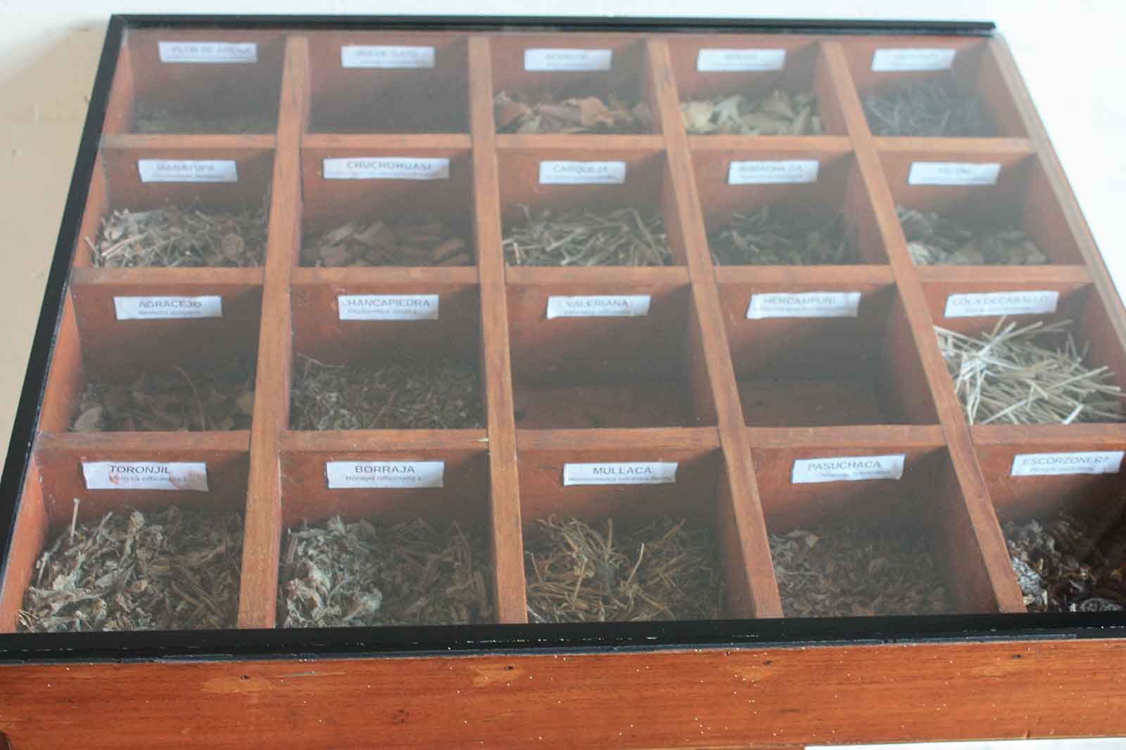 A display at the EsSalud clinic in Trujillo presents an array of traditional plant-based remedies.