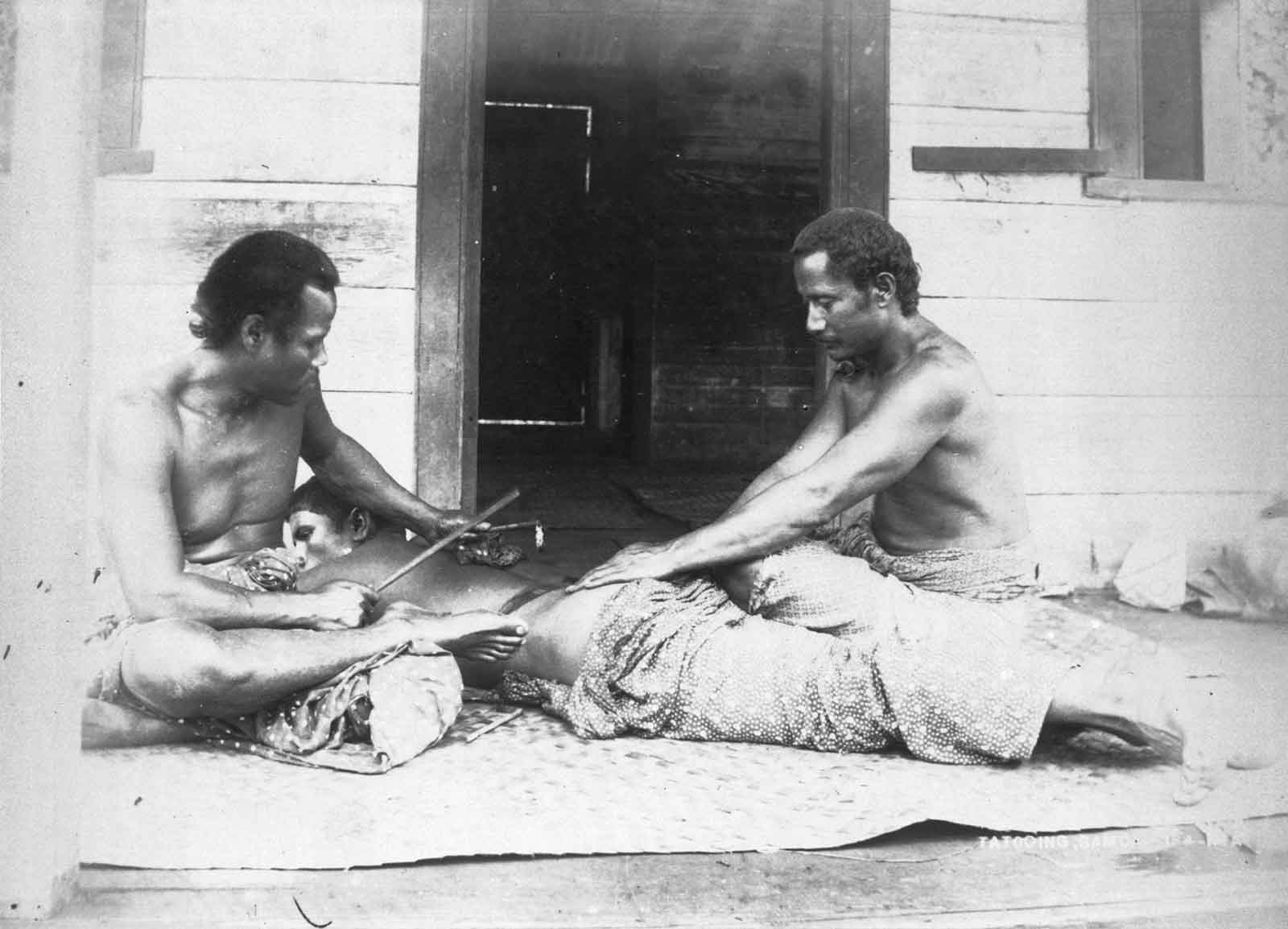 A nineteenth-century Samoan tattoo artist inks a traditional design on a man’s back.