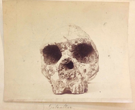 I had been flipping through Busk’s photographs of fossils, many of which were of fragmented cave bear bones, when I came upon an image of the Gibraltar Neanderthal skull. Its large, hollow eye sockets stared up at me. Without thinking, I raised the photo toward my face for closer examination. It was then that a voice from across the room brought me back to reality, reminding me that photos must be kept on the table. These precious images are not to be held or breathed upon. I carefully placed the picture back on the table and continued to stare at it in awe.