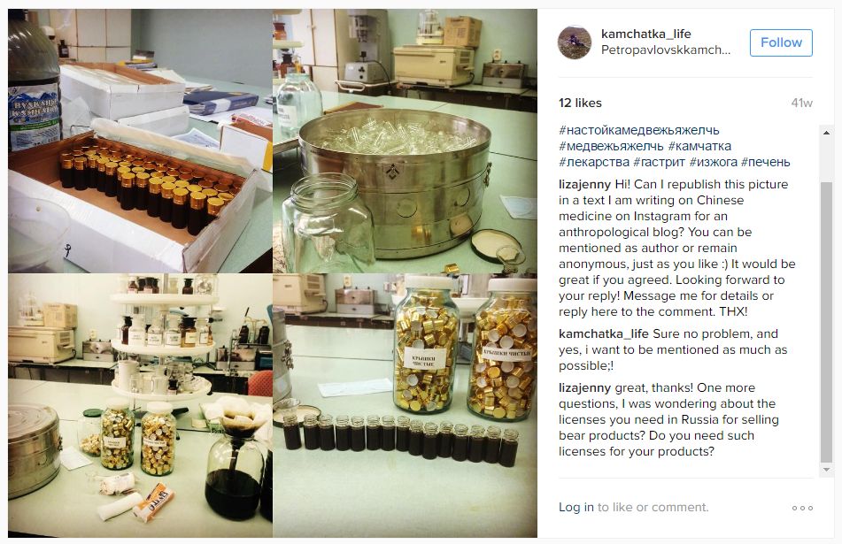 The same is true for the photo from the Kamchatka Peninsula. That account user, “kamchatka_life,” is aiming their posts at a Russian-speaking alternative medicine audience, with hashtags such as #настойкамедвежьяжелчь (bear bile tincture). The user seems to stand behind the use of bears for creating these products and is clearly proud of his business: When I asked if SAPIENS could reprint the photo, he replied: “Sure no problem, and yes, i want to be mentioned as much as possible!”