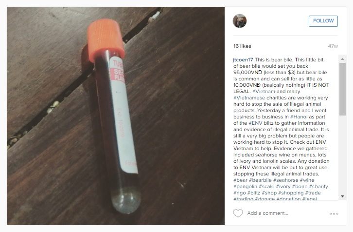 Another picture showing bear bile in a little phial found in a Vietnamese market has a different tone. This one was uploaded by a person who describes herself as an English teacher living in Hanoi. Her other posts show pictures from her personal life: the city, her cat, herself, and friends. The photograph of the bear bile phial is tagged with hashtags such as #bearbile, #trade, #donate, #illegal, and #envvietnam. The user asks people to help fight the illegal animal trade and donate to the organization ENV Vietnam. For her, the existence of this phial of medicine is proof of a bear’s suffering and of environmental crime.