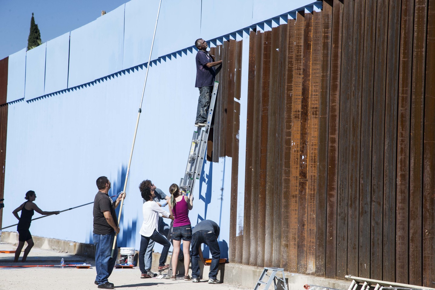 Walls are not just barriers. They are also surfaces and symbols that can be employed for subversion, and people use the wall in Nogales to protest its very existence. Protests have come in the form of art installations, graffiti, placards, and demonstrations. Chicana artist Ana Teresa Fernández, for example, tried to visually erase the bollard wall with sky-blue paint.