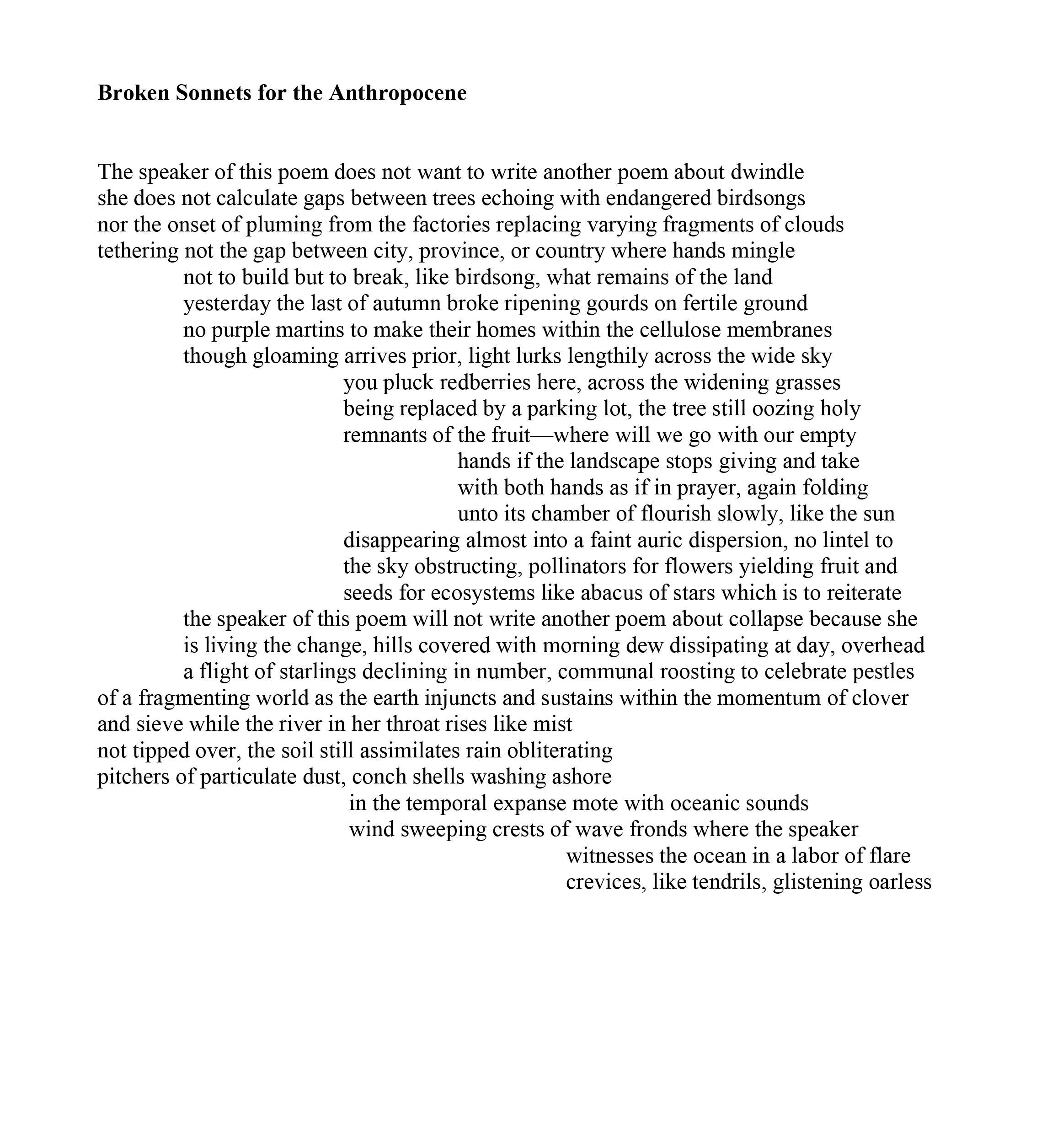 “Broken Sonnets for the Anthropocene” is part of the collection Poets Resist, Refuse, and Find a Way Through. Read the introduction to the collection here.