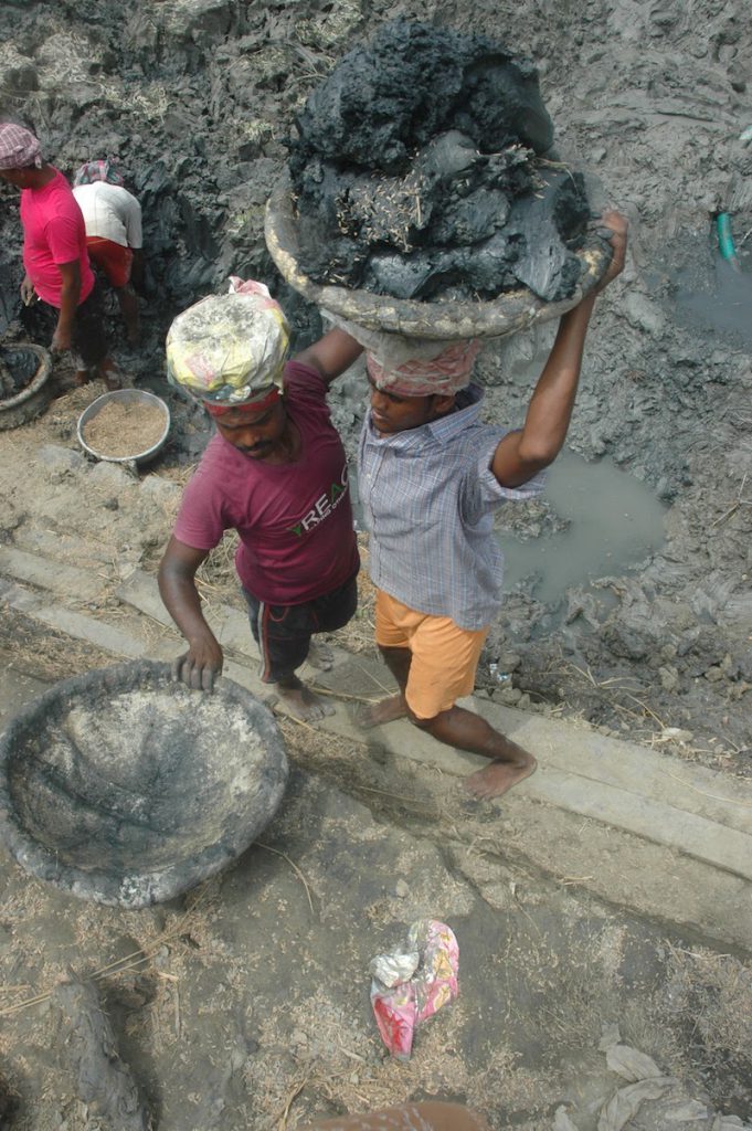 Men take on mati katar kaaj, or the work of cutting mud, which dredges earth to create a platform for raised homes.