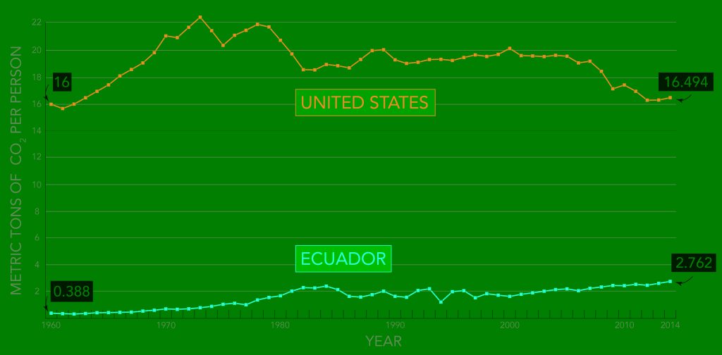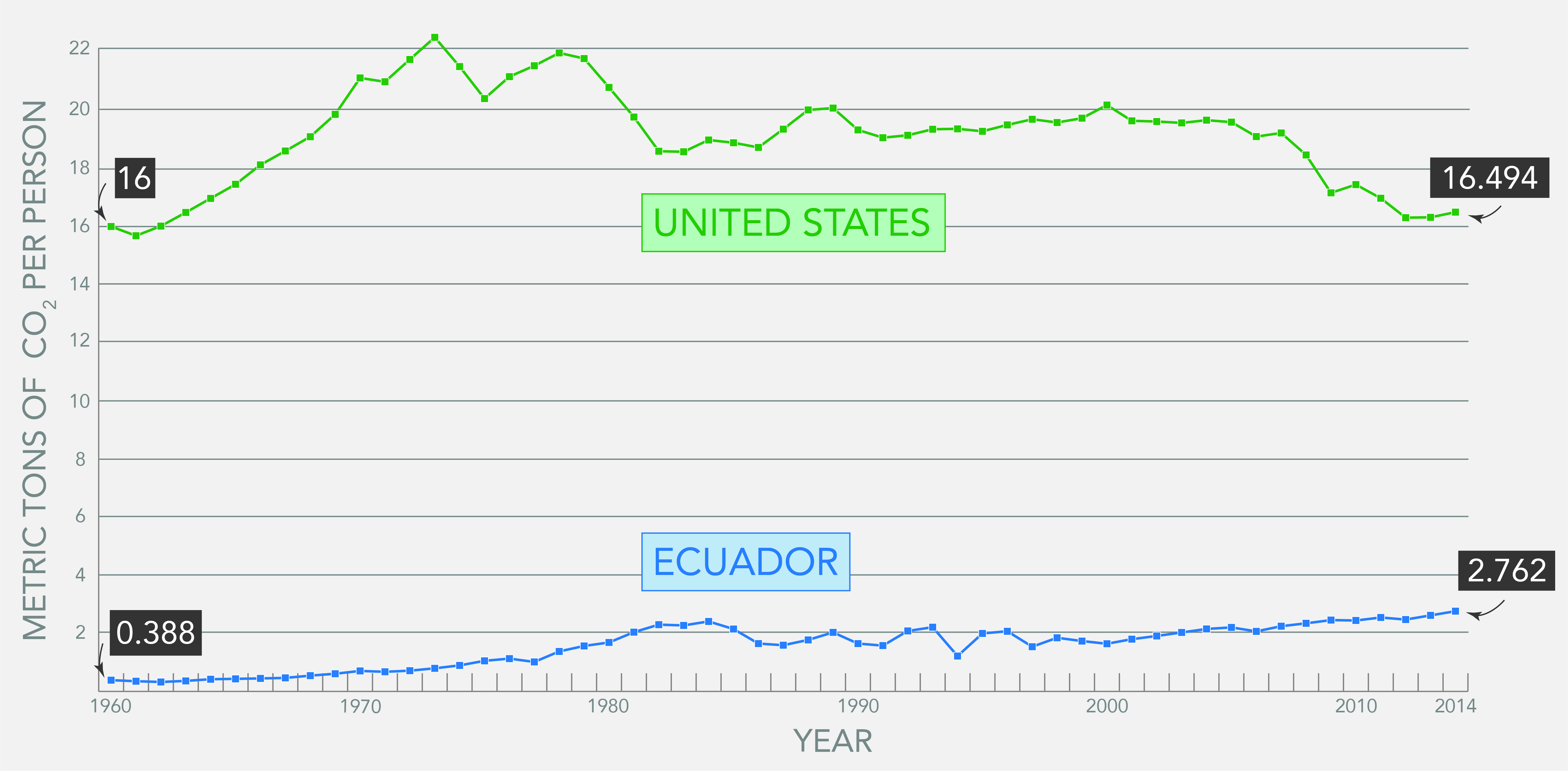 This global inequality is one of the greatest tensions at the heart of climate change. According to data from the World Bank, for example, while the United States emitted 16.49 metric tons of carbon dioxide per person in 2014, Ecuador emitted 2.76 metric tons per person.