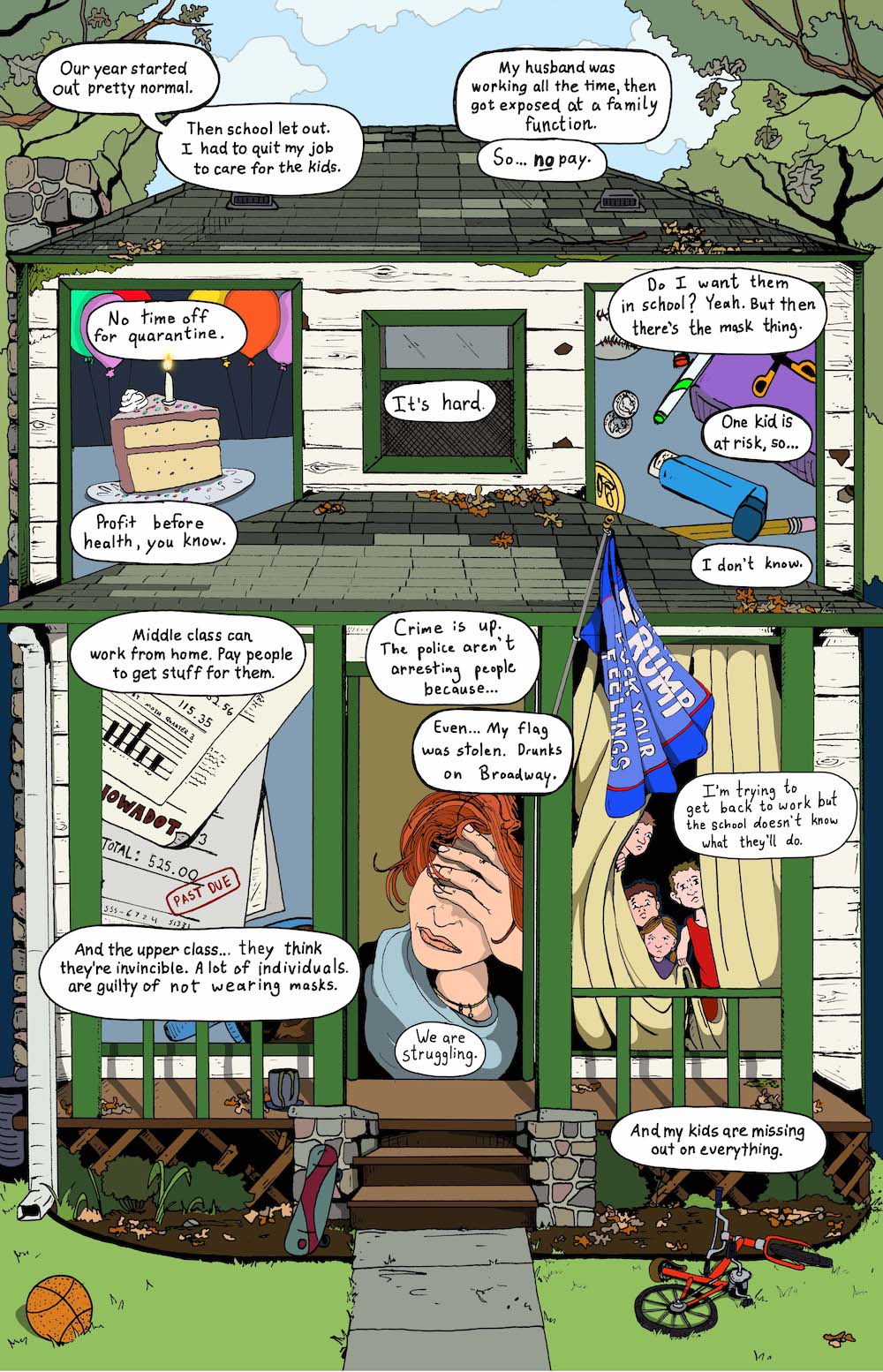 For many working families in Okoboji, COVID-19 transformed how they cared for their children. This pressure was particularly difficult for parents—and especially mothers—working in restaurants and manufacturing plants, such as Cheri [1] [1] All names of interviewees have been changed to protect people’s privacy. . As I recount in Unmasked: “When we spoke in July, Cheri was exhausted after months of struggling financially and caring for her four children. ‘Our year started out pretty normal,’ she said. ‘But then they let school out, so I ended up quitting my job because I had to stay home with the kids. And day care closed. And nobody wanted to watch anybody’s kids because they were afraid they were gonna get sick.’” This first comic illustrates Cheri’s perspective—one many women in Okoboji shared with me during the early days of the pandemic.