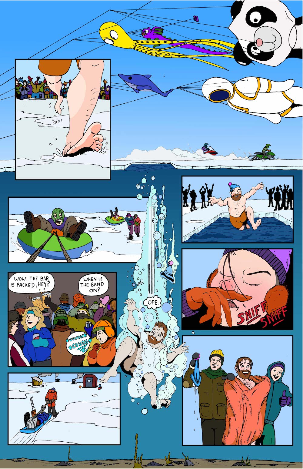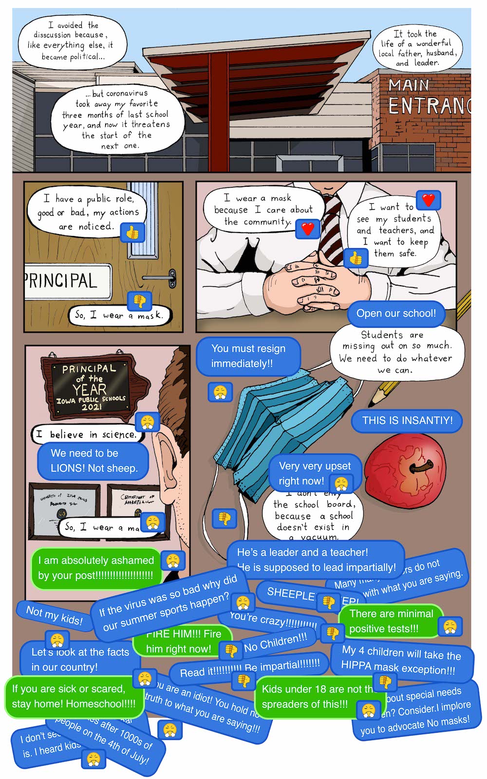Recently, I collaborated with Aaron Gronstal, an astrobiologist and visual artist also from Okoboji, to create a series of comics based on this research. Aaron, who now splits his time between Scotland and Okoboji, also felt the collective shifts of the first pandemic summer. He was interested in working together to find a comic illustration style that could help translate Unmasked into visual form. Aaron designed, drew, colored, and edited each full-page piece to help tell the complicated story of COVID-19 in Okoboji.