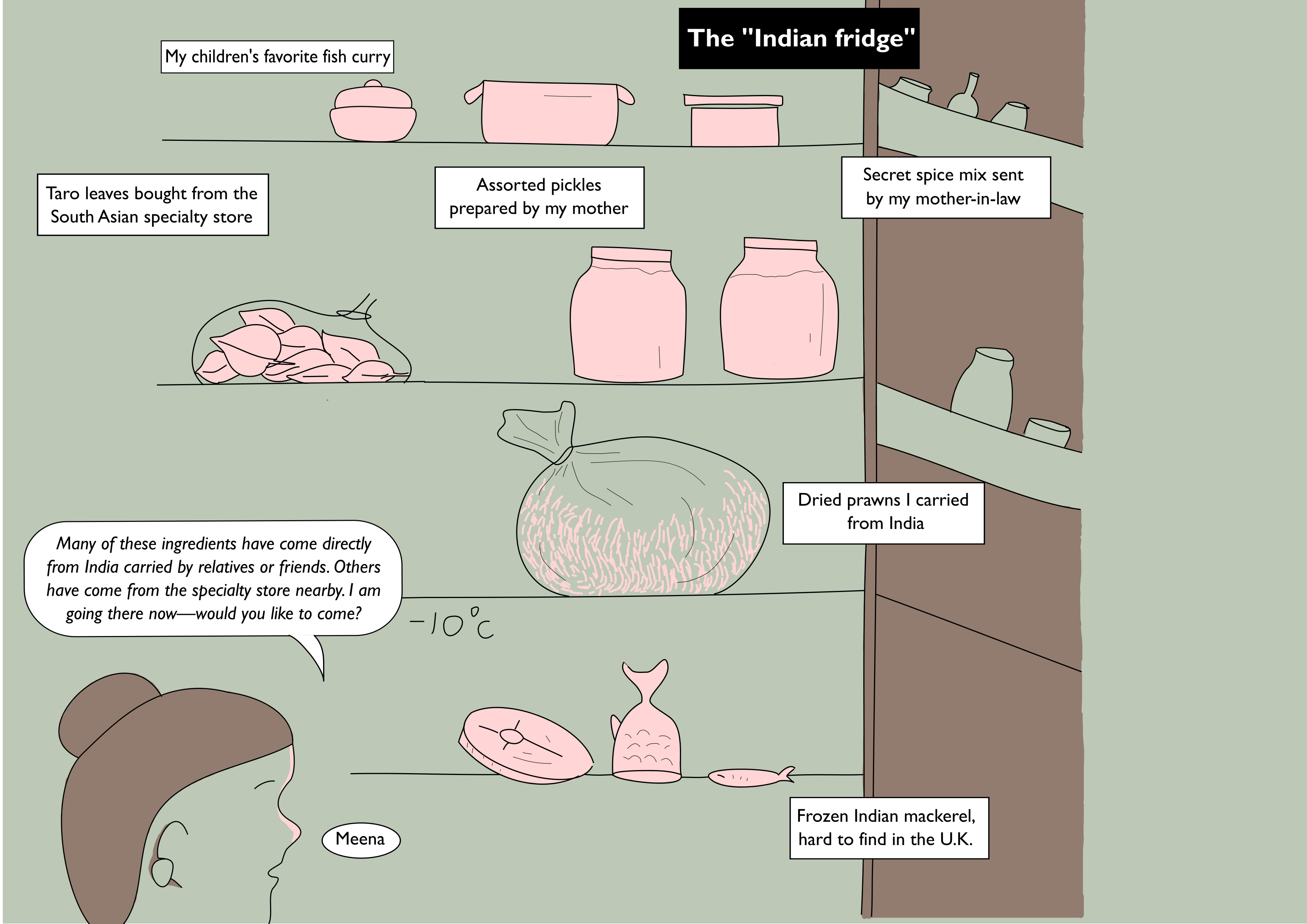 Meena, one of my interviewees, showed me her “Indian fridge.” [1] [1] All names of interviewees are pseudonyms. Most people do not have a separate fridge for special heritage ingredients. However, most find ways of accessing and using these products to preserve traditions. Meena makes sure she cooks her children’s favorite fish curry, a dish that ties them to their Maharashtrian heritage. She also stores dried fish that she bought in India, which reminds her of flavors she grew up with.
