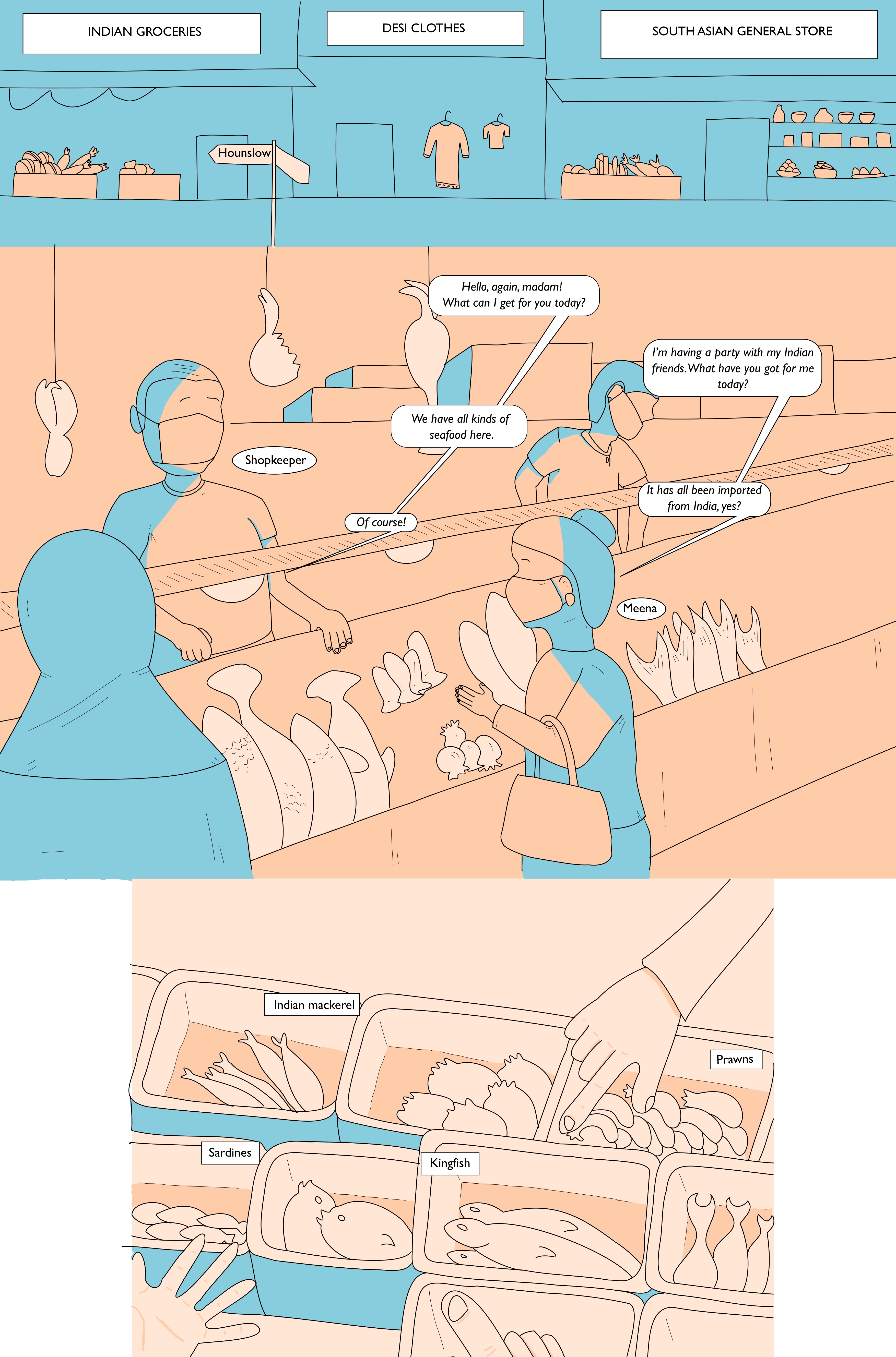 The comics below, based on my research with migrant communities in London, explore how food and culture interact with xenophobia and migration. The popularization of Indian cuisine in the multicultural U.K. has only been possible due to migrants—especially women, who do most of the food shopping and preparation within families. To explore these processes of cultural maintenance, I went on an anthropological tour of my own community’s migrant food spaces—ethnic stores, markets, and kitchens.
