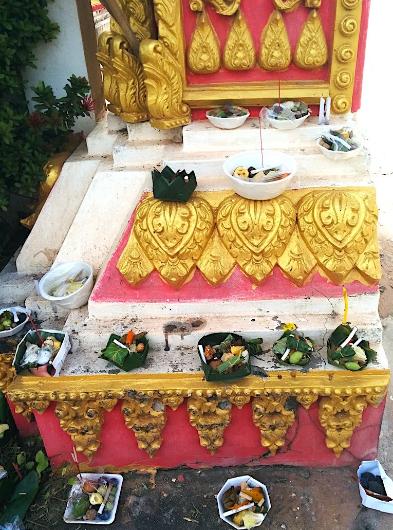 “Yes, that is because your culture is bad about feeding ghosts, so yours are very hungry. So, you are afraid of ghosts.” Chantha scooped coconut sweets onto ovals of banana leaf, laying the leaf platters among the roots of a sacred tree growing on the temple grounds. For each platter, she unscrewed the cap from a water bottle, presumably so the ghosts wouldn’t have to struggle with disembodied hand coordination, poured a first sip for the spirits of the earth, and then laid the uncapped bottles by the coconut sweets. “In Laos, we are compassionate with our ghosts.”