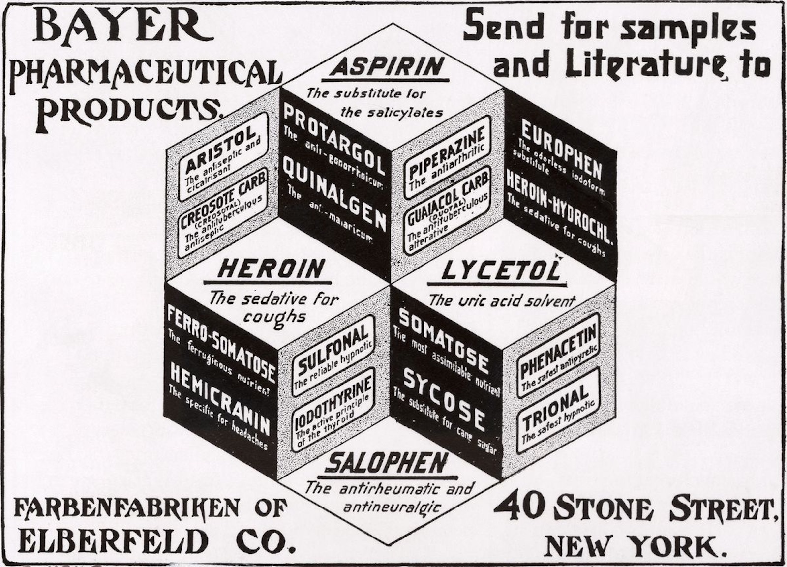 For example, take heroin. It’s illegal today, but heroin was introduced in 1898 by the Bayer Company, manufacturers of buffered aspirin, as a nonaddictive alternative to morphine. (That was incorrect, of course; it’s highly addictive.) Bayer even marketed it to white, Victorian housewives as an over-the-counter cough syrup for children.