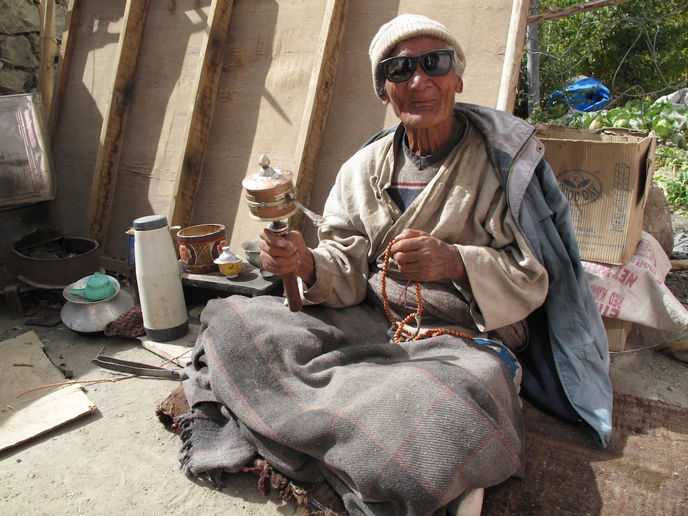 In his mid-70s, Tashi had spent a great deal of his life walking in the Himalayan mountains, plying the trade routes to Tibet and herding animals in the mountains. People called him Meme Tashi (“Grandfather Tashi”). Age had taken its toll on his body, and he could no longer do this work, but his connection with his beloved mountains was still strong. Having retired from active life, Meme Tashi spent his days spinning his prayer wheel under the sun while facing the mountain pastures of his village in the Sham area of Ladakh, a thermos of butter tea at his side, some dried apricots to chew on, and a woolen blanket on his lap.