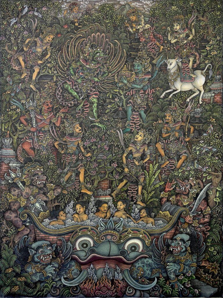 The genre of Batuan contemporary painting that emerged in the early 20th century depicted Balinese culture for an international audience. Yet it remained deeply rooted in local life and personal expression. The artists of this original style balanced innovation with attention to enduring cultural concerns. They were particularly interested in exploring the invisible powers that threaten to disturb and destabilize human activity, and people’s attempts to uphold individual and collective harmony through aesthetic ritual practice. The elements of this genre remain evident in many Batuan paintings today.