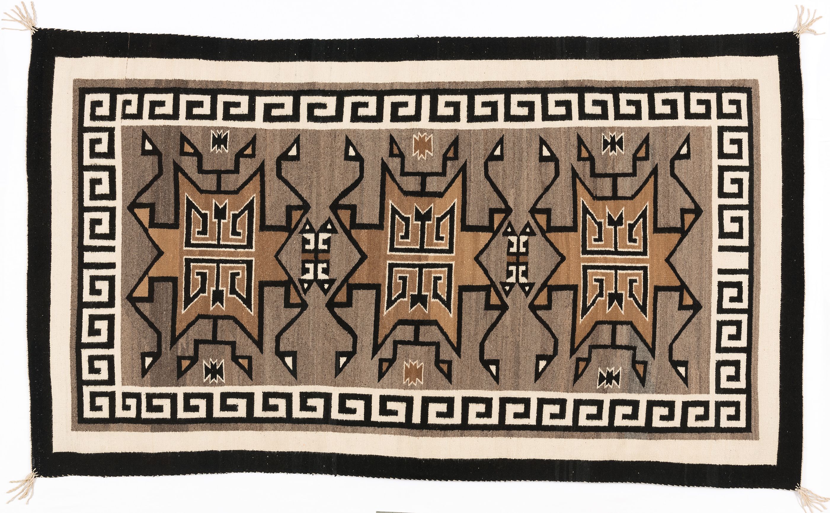 Native designs communicate tribal, familial, and individual identities and beliefs. “Design elements hold interpretation for each family and do not hold one universal meaning,” states Navajo tribal member Lynda Teller Pete in an upcoming book on Navajo weaving called Weavers, Collectors, and Changing Markets: The Crane Collection of Navajo Textiles. One example of the deeply personal nature of tribal designs is the ch’ihónít’i, or “spirit line,” that many Navajo weavers incorporate into their rugs. It’s a small, thin line that runs from the central design area to the rug’s outer edge. The spirit line, also referred to as a “weaver’s pathway,” is described by Teller Pete as a connection between a work and the individual weaver’s energy, spirit, and creativity.