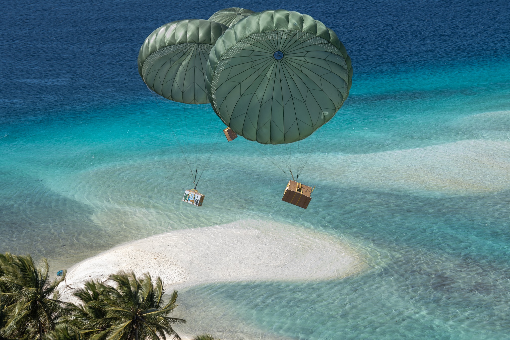 Over the following week, aircrews in red stocking caps will deliver 210 bundles—averaging 750 pounds each—to nearly 60 Micronesian islands. As the crates drop, sage-colored parachutes burst open, like jellyfish descending toward turquoise waters. Islanders appear on shorelines, then carry the cargo to communal sites where they distribute it among local families. The parcels are stuffed with white rice, canned meats, fishing equipment, and children’s toys.
