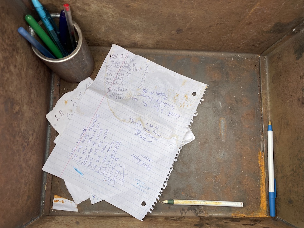 The posts closest to the gravel parking lot were covered with stickers, many from union chapters from across the state and country. During my visit, I found a metal box holding a cup of pens and a few hastily torn out pieces of notebook paper with statements of appreciation for miners. Flowers, flags, and coins had been laid at the base of the memorial. Multiple signs offered the UMWA interpretation of the massacre site. Adjacent to the memorial was a covered picnic area and a locked off area that appeared to have once been a stage or stand. Paint was peeling off the benches and picnic tables, hinting at a lack of official upkeep.