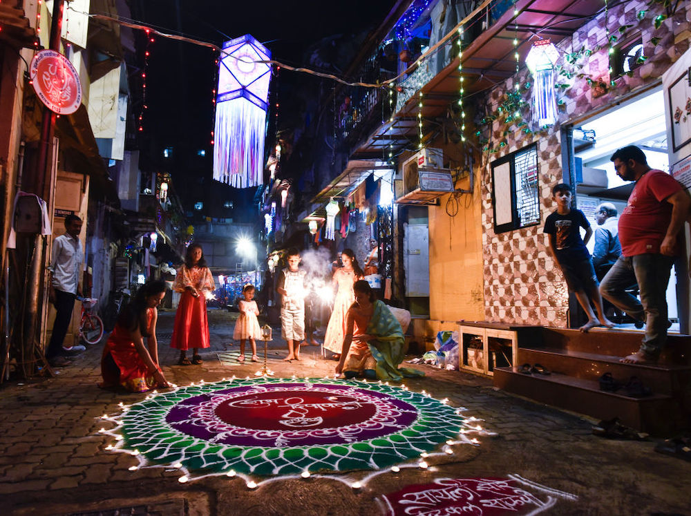 Diwali arrives at the end of the monsoon season—a time of bounty that waters the rice paddies, fills the aquifers, and keeps the cows fed. To celebrate the end of this season during the festival, people clean their homes, then illuminate and decorate them with clay oil lamps (diyas) and rangoli, geometric patterns made with colorful sands, powders, rice, stones, and flowers. Once the elaborate decorations are completed, windows are left open to welcome Lakshmi, the goddess of prosperity, or other household deities. In the streets, observers dress in their best clothes and light sparklers and firecrackers to scare off evil spirits.