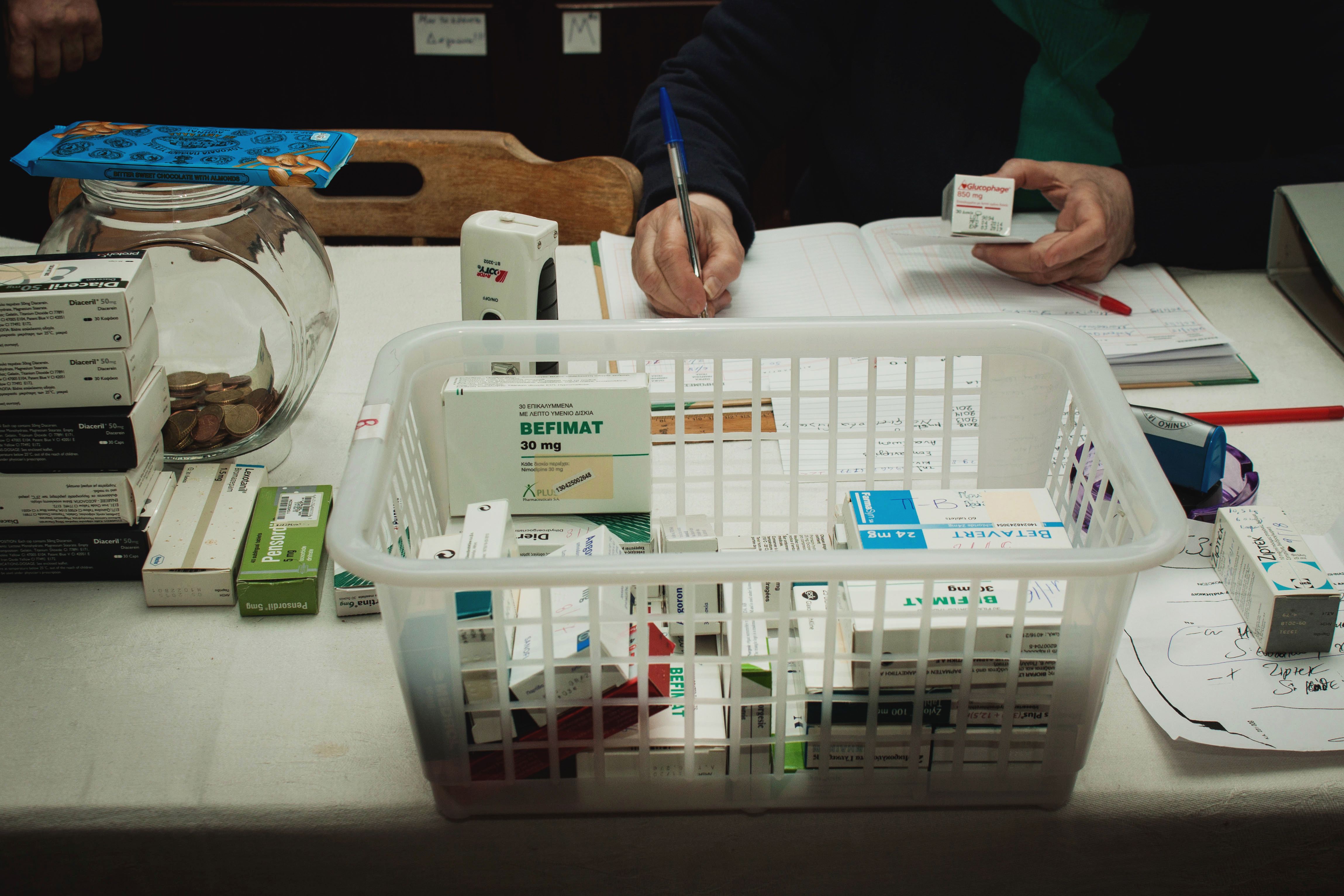 A tall, white-haired man arrives wearing the black armband of mourning. His mother recently died, and he has brought unused—and now unneeded—medicines and supplies. I and other volunteers help the man carry large garbage bags from his car to the cool kitchen in the back of the pharmacy. On a long table, medicines are spread out, ready to be checked and organized; metal shelving units along the walls are lined with more medications stored in colorful shoeboxes from a neighborhood shoe store.