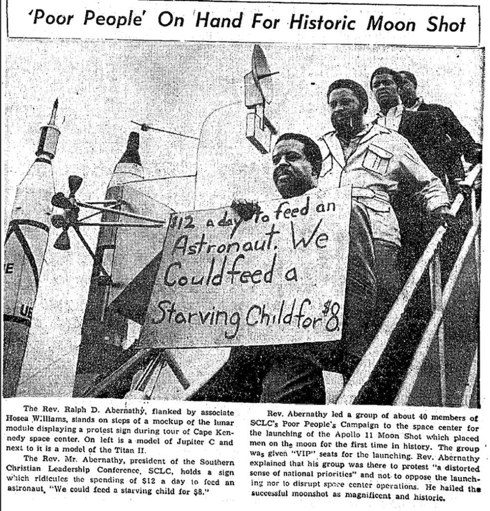 A 1969 newspaper clipping shows civil rights leader Reverend Ralph Abernathy leading a protest at the launch of the Apollo 11 spacecraft, which landed humans on the moon for the first time.