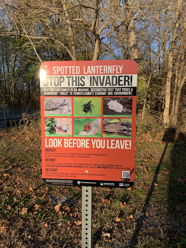 By 2020, at the height of the COVID-19 pandemic, several mid-Atlantic states issued kill-on-sight orders to prevent the spotted lanternfly’s spread. People started gleefully hunting the insects and stomping them to death. Their demise became something of an obsession; one Pennsylvania man developed Squishr, an app for residents to track and post photos of their kills. At rest stops along interstate highways, USDA and Pennsylvania Department of Agriculture signs instructed travelers to “Look Before You Leave” and to check vehicles to avoid transporting the insect across state lines. Other messaging was more explicit: Signs reading “Stop This Invader!” were posted at local dog parks, at trailheads in state parks, and outside grocery stores.