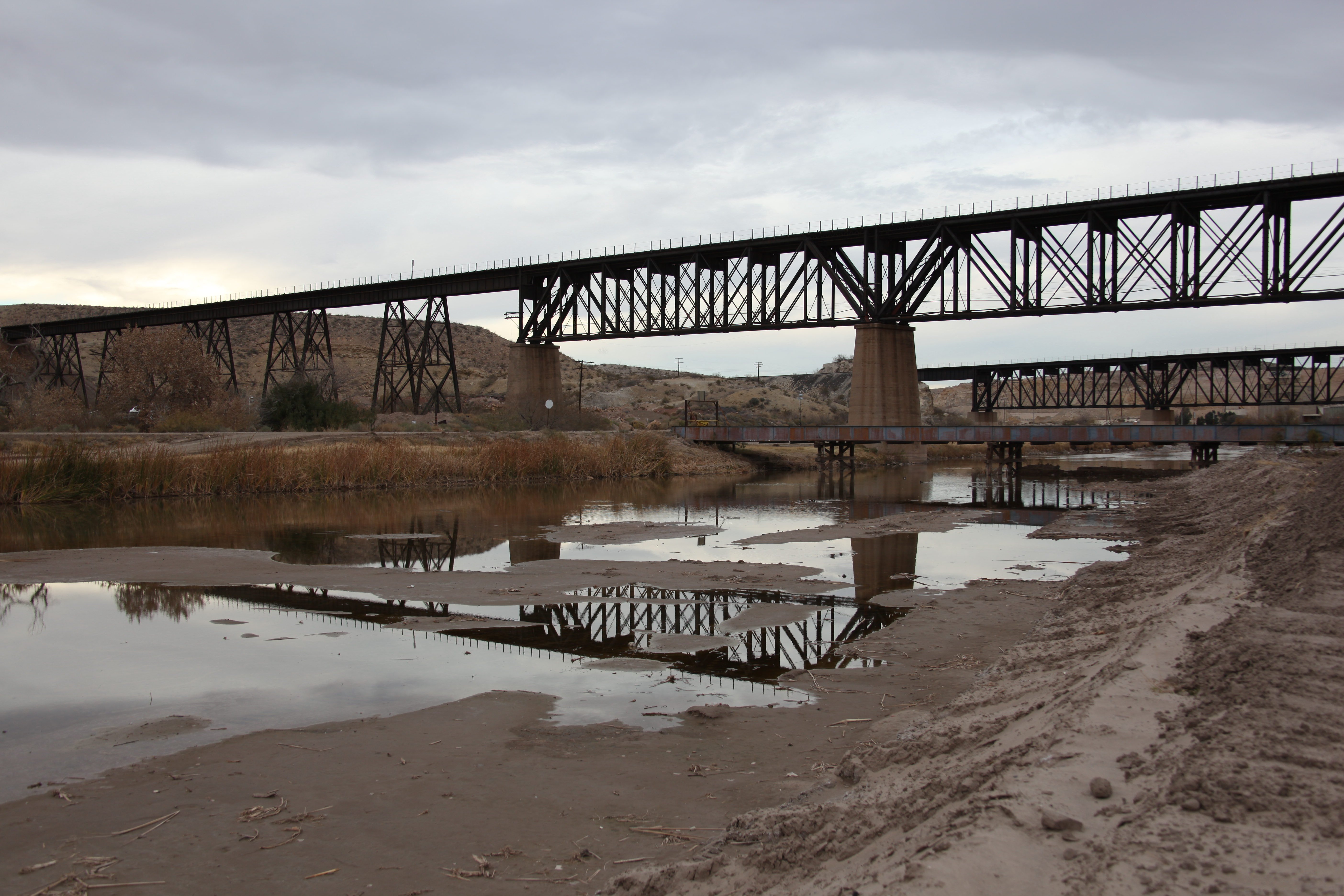 The three border-crossing bridges that connect El Paso to Juárez span the ghost-river’s width. Technically, the Rio Grande “runs” below these bridges, but it has been replaced by a concrete channel, with a stagnant line of brown dirty water sitting in its center.