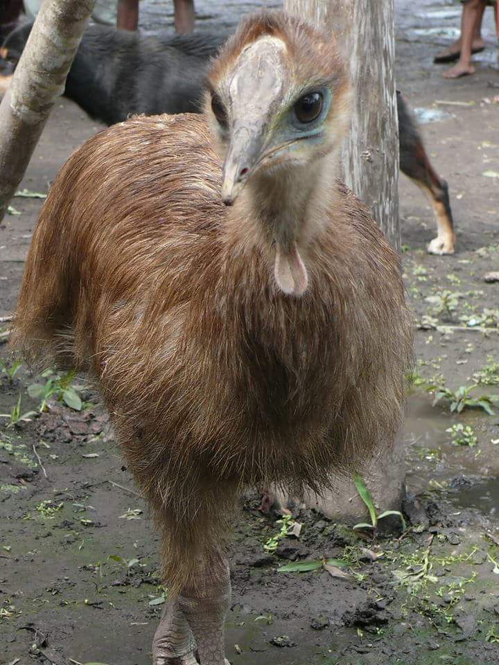 Ruben roamed the village, his fragile whistle wafting in the midafternoon air as a melodic backdrop to the villagers’ conversations. Community members fed him raw rice, biscuits, and instant noodles. They created a resting place for him in the backyard of the local church, where the priest also kept doves and chickens. Ruben, gangly on his skinny legs, towered over his shorter and stouter avian yardmates. (Cassowaries are large flightless birds; when Ruben is full-grown he could reach nearly 6 feet tall.) He was a shy creature, with brown and cream striped plumage, a tiny beige wattle that always seemed something of a nuisance, and a barely noticeable casque under the tufts of light feathers crowning his angular head.