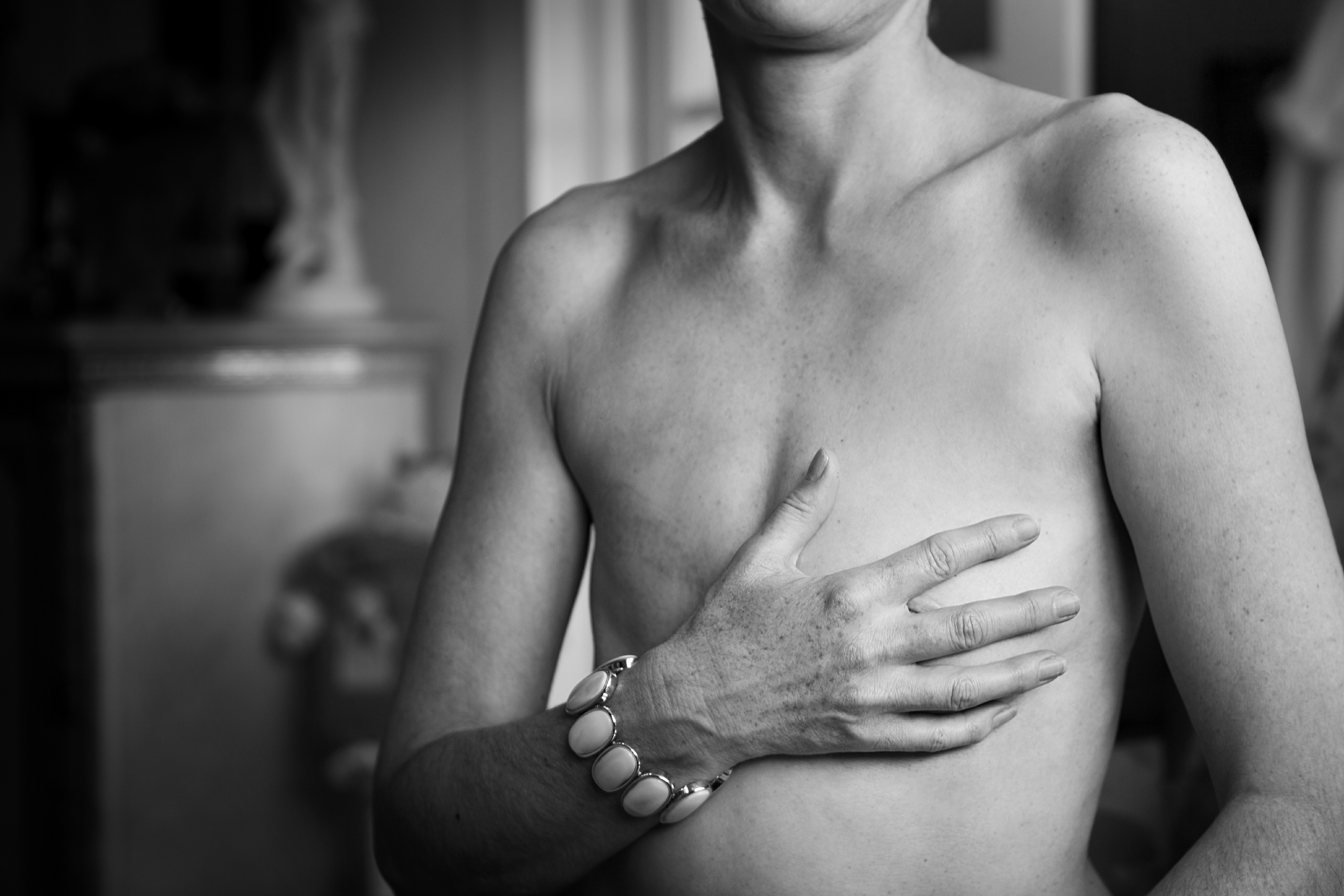 A black-and-white photograph shows a woman’s chest and torso. Her right hand, which wears a bracelet, reaches across her body to cover her chest.