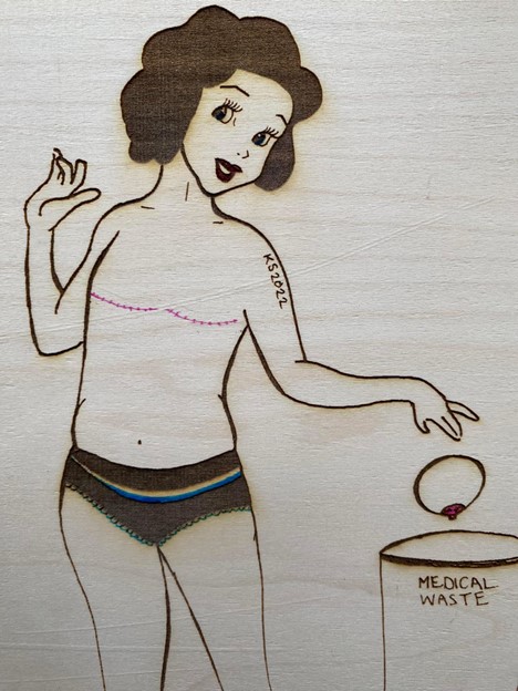 A cartoon depicts a playfully posed topless woman with two scars on her chest dropping a prosthetic breast into a bin labeled “medical waste.”