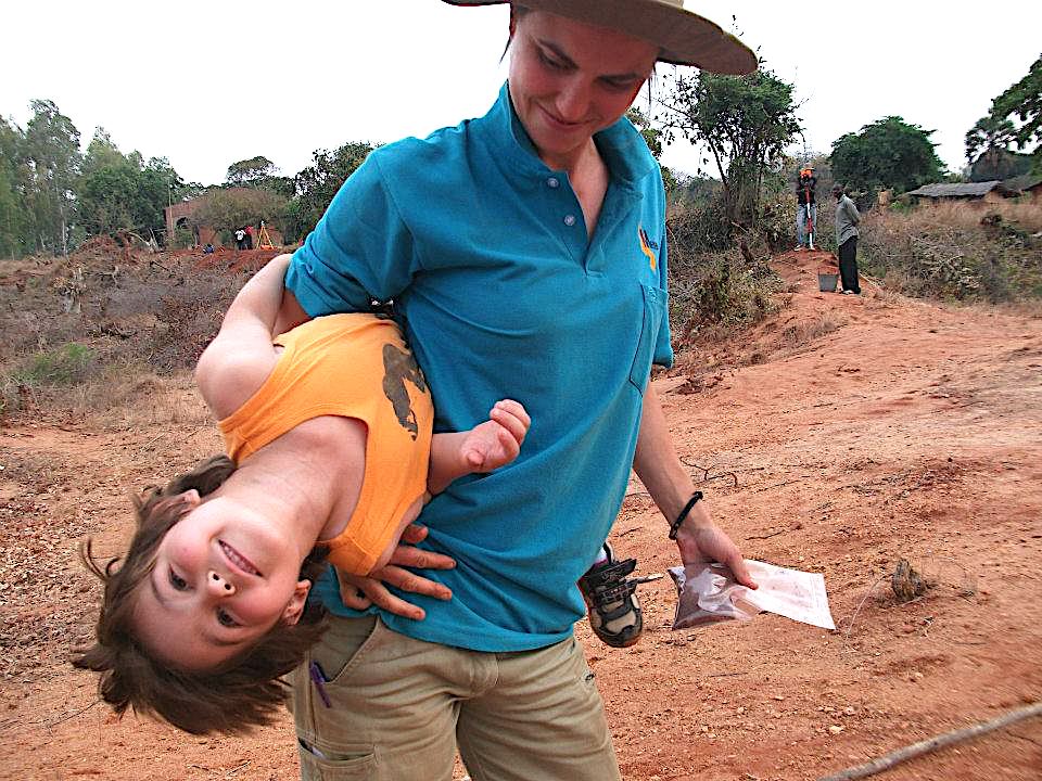 La coautora Jessica Thompson carga a su hijo Bryan en el yacimiento arqueológico de Bruce en Karonga, Malawi.
