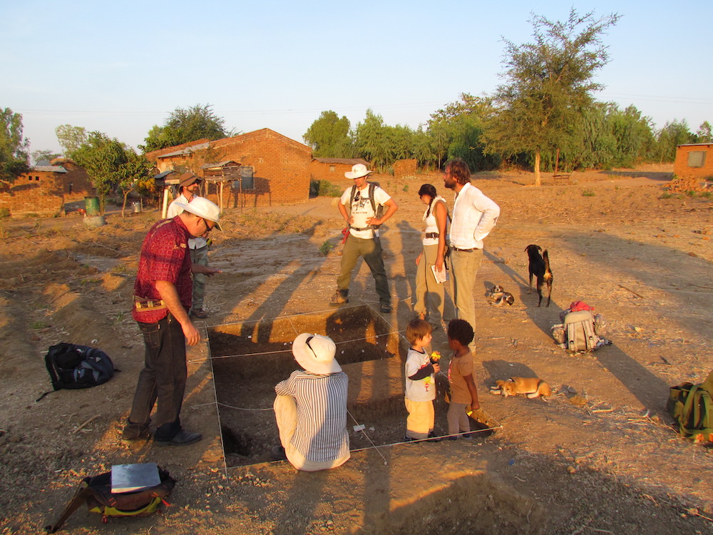 Thompson, sus colegas y sus hijos se reúnen en el yacimiento de la aldea de Mwanganda, en Malawi.