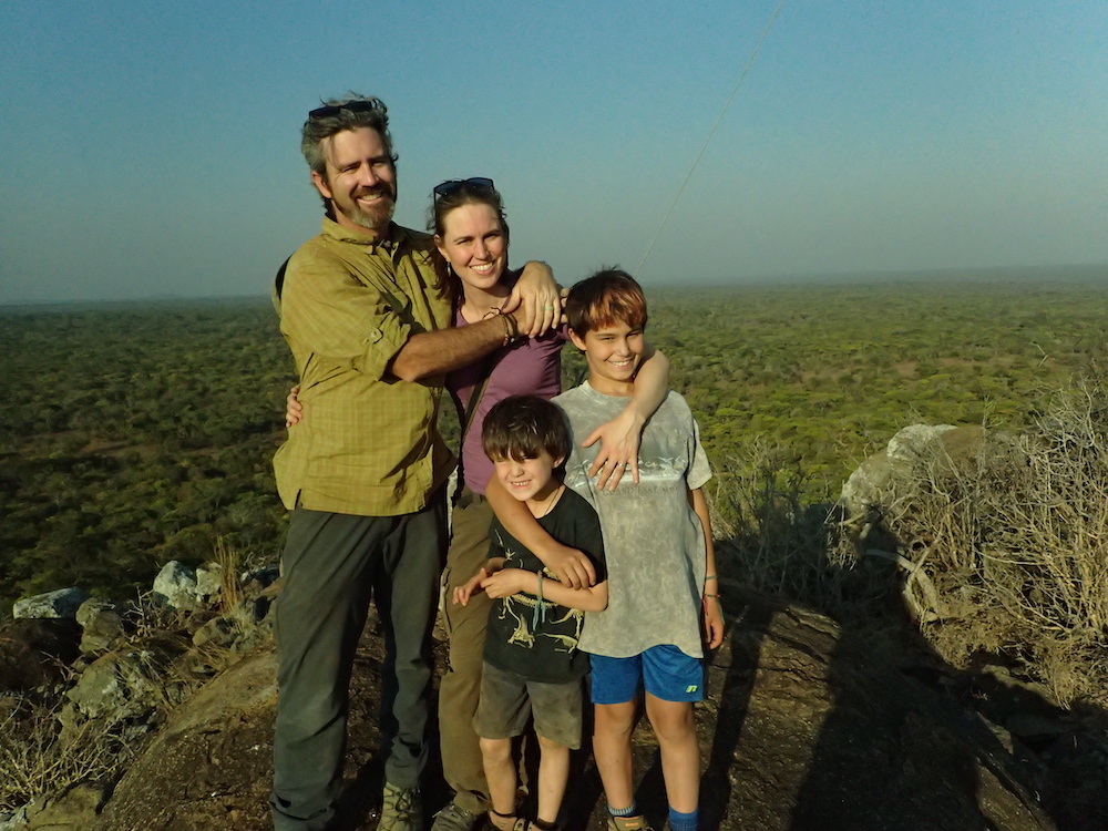 Thompson, su esposo, Jacob, y sus dos hijos, Bryan y Ethan, visitan un yacimiento de arte rupestre en Malawi.