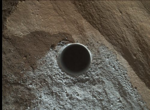 On April 24, 2016, NASA's rover Curiosity photographed a hole drilled into the surface of Mars to test the composition of Martian rocks.