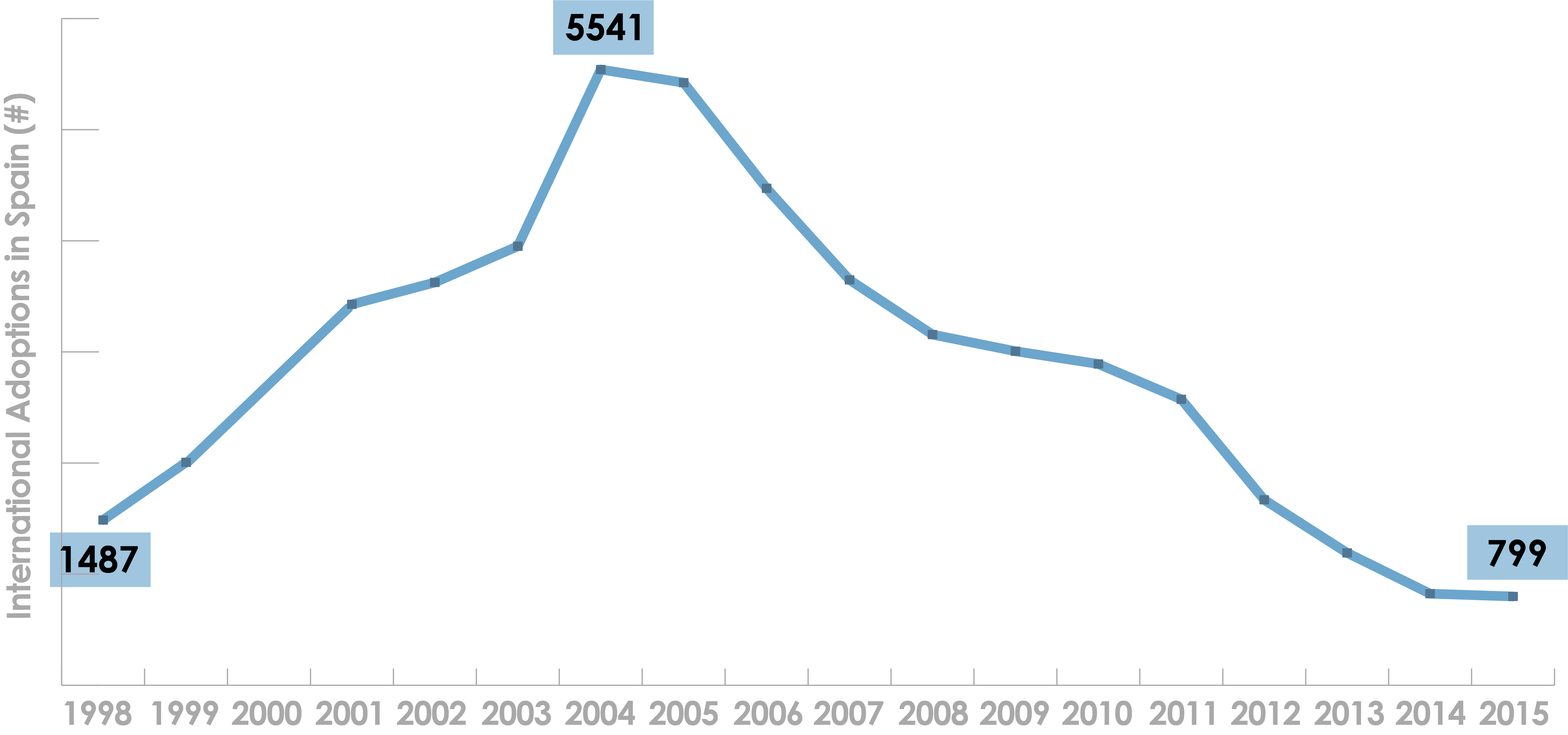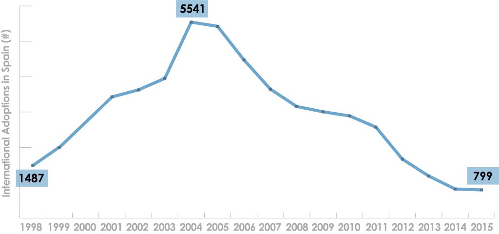 En la primera década del siglo XXI, España alcanzó uno de los más altos índices de adopción del mundo. En 2004, el año de más adopciones internacionales en España, se realizaron 12,4 adopciones cada 1.000 nacimientos, en comparación con las 5,54 por 1.000 en EE UU en el mismo año.