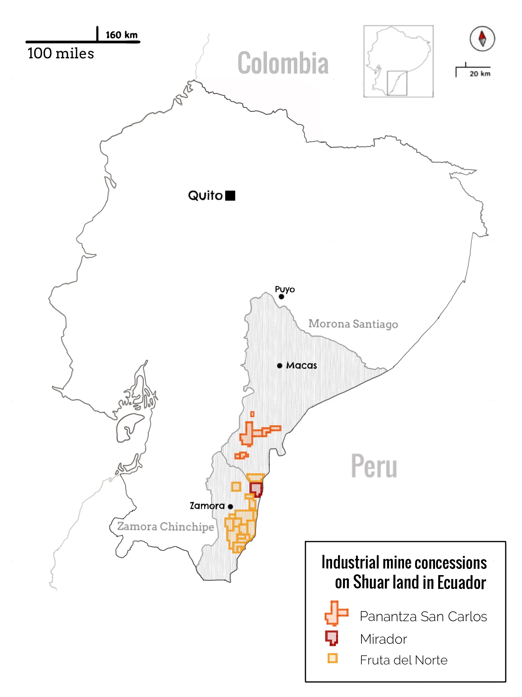 Inversionistas extranjeros junto con el gobierno ecuatoriano empezaron a planear la extracción industrial de minerales en la región a principios de la década de 2000. Al principio, algunas personas shuar se mostraron esperanzadas por las oportunidades económicas que les prometían. Mirador se inauguró en 2019, con gran pompa, como la primera y mayor mina industrial de cobre y oro del país. Desde entonces, la mayoría de las promesas que hicieron los inversionistas y los líderes del gobierno han quedado en nada, y se ve poco crecimiento económico entre las comunidades shuar. Recientemente, organizaciones ecologistas han advertido del posible riesgo de colapso de las dos presas de relaves de la mina, estructuras donde se contienen los subproductos tóxicos de la extracción minera. Esta y otras graves preocupaciones ambientales siguen, hasta la fecha, sin respuesta.