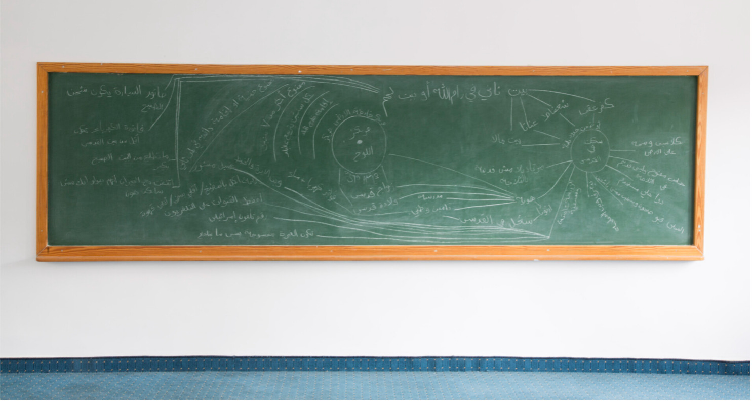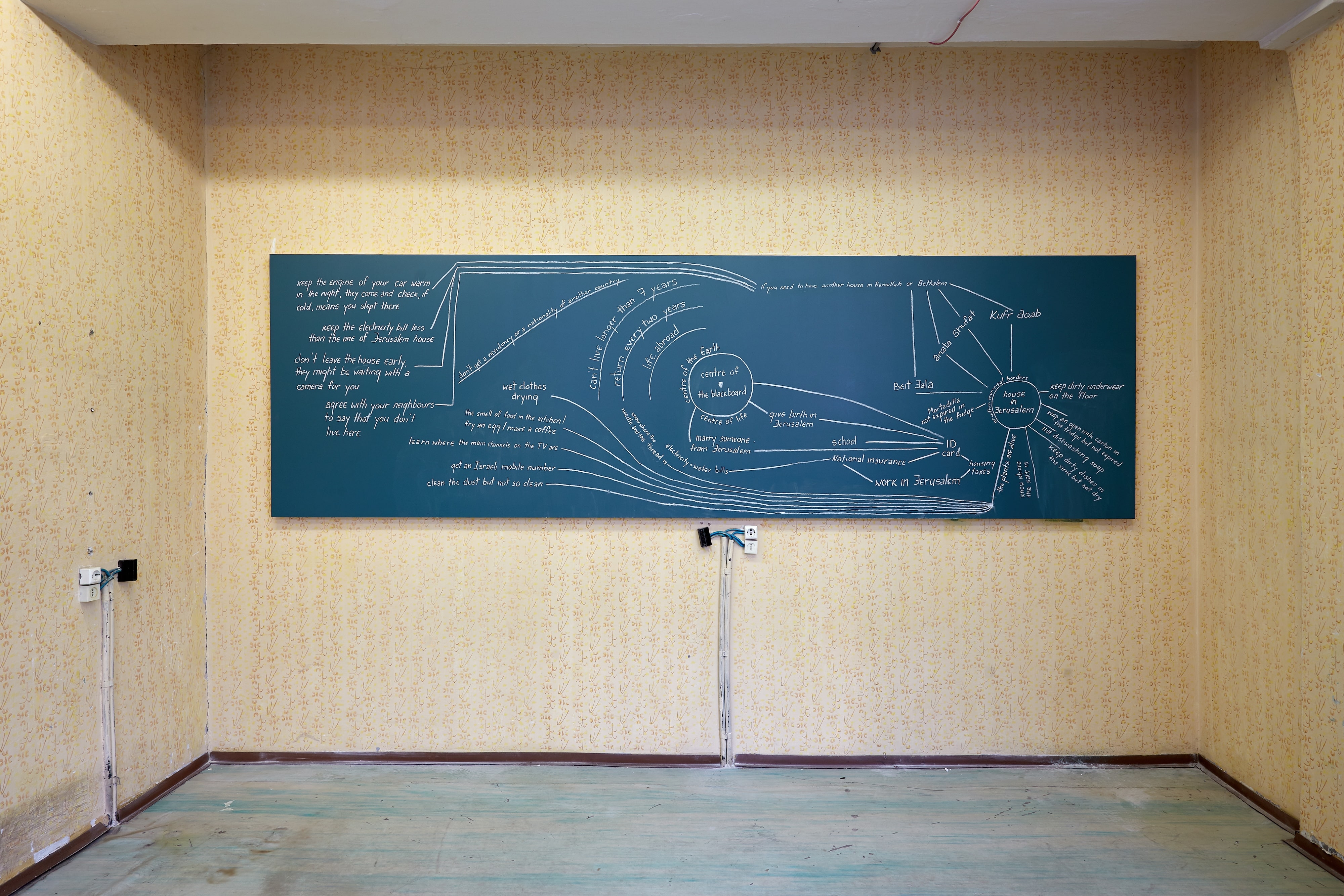 Em seu lugar, o artista de Jerusalém Essa Grayeb desenhou o diagrama em árabe no quadro-negro com base nos desenhos fornecidos por Khalili. O desenho lista aspectos da vida no precipício entre manter um “centro de vida” e o deslocamento: carteiras de identidade, restrições sobre onde e como se pode viver, os objetos da casa, os problemas de ter várias residências, seguro saúde. Como Khalili não pode acessar Jerusalém, os detalhes apresentados em seu diagrama foram baseados em histórias de seus parentes, amigos e encontros com outros moradores de Jerusalém. Seu trabalho foi uma releitura agregada dos comportamentos e padrões que se deve aprender a cultivar para que a vida palestina seja viável em Jerusalém.
